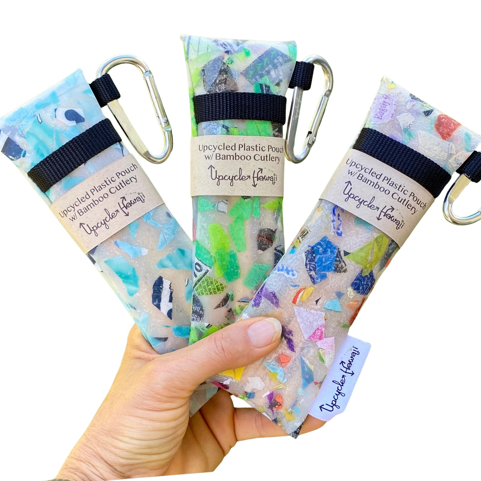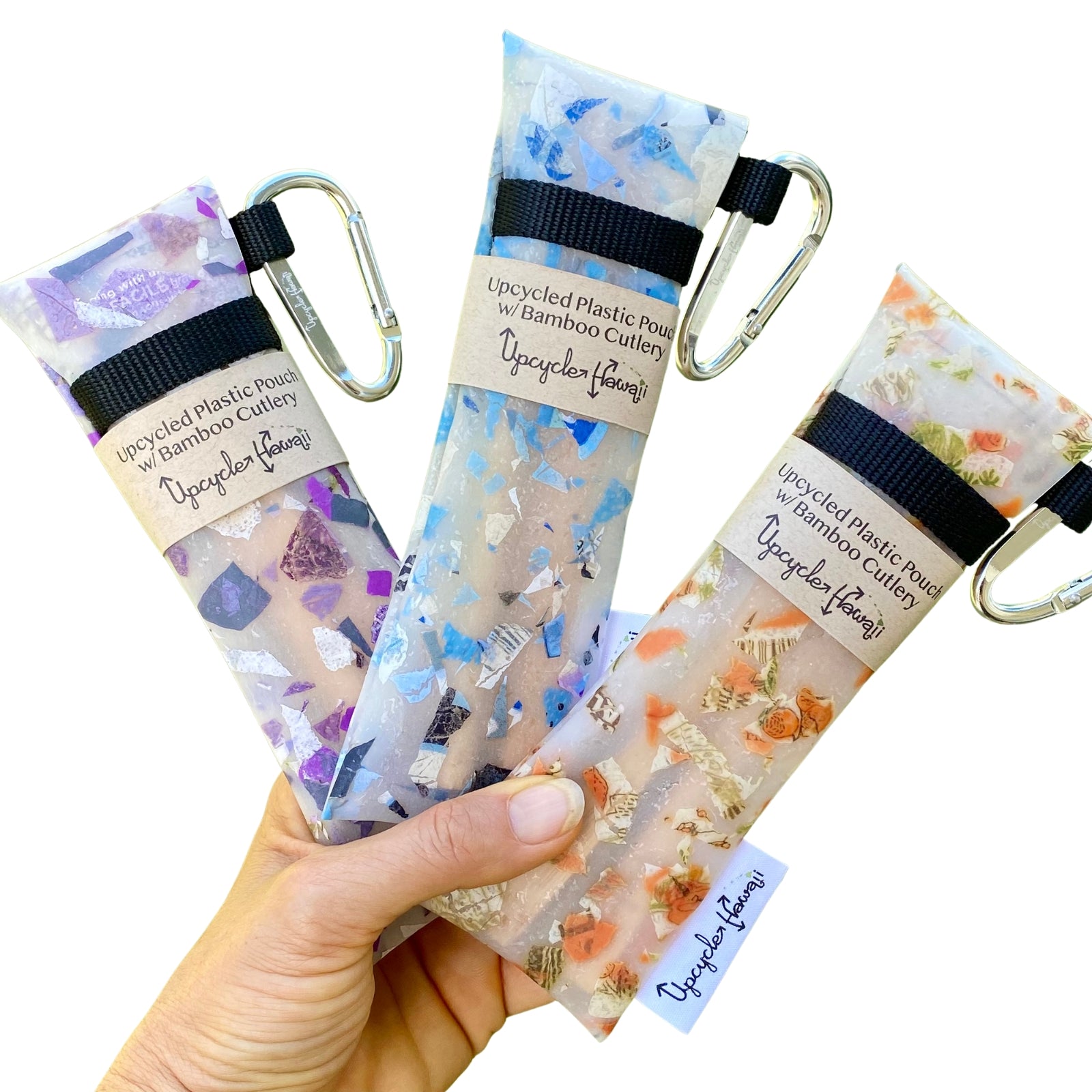 These slide pouches are handmade using reclaimed sheet plastics collected from local residents and businesses. Heat and pressure are applied to melt multiple layers of shredded plastics and packaging waste together in a fusing process.
