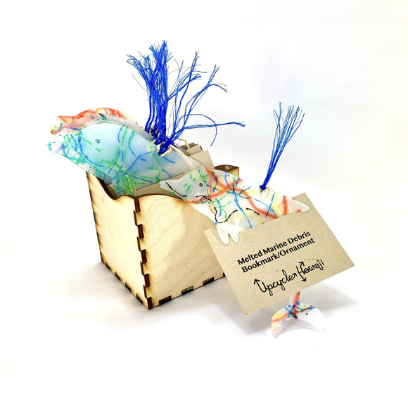 Trash to treasure!  Our melted marine debris products get their color from the fibers of ropes and nets which are recovered during local beach cleanup efforts.  Selected cuts of rope are taken home before being washed and dried.  Cleaned portions are then broken down into their individual fibers which is melted together with post-consumer plastics to create a lightweight and durable material.  Check out our Earrings, Bookmarks, Keychains, Ornaments, Nightlights and more!