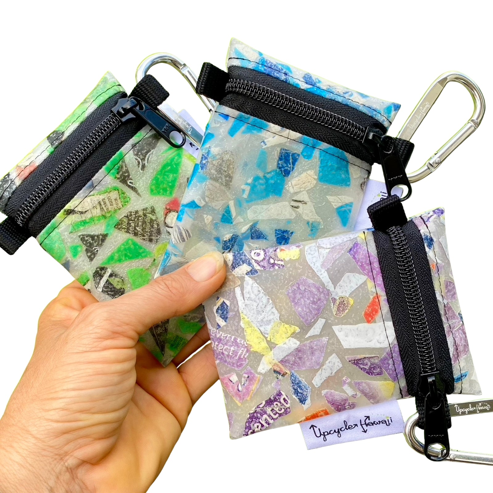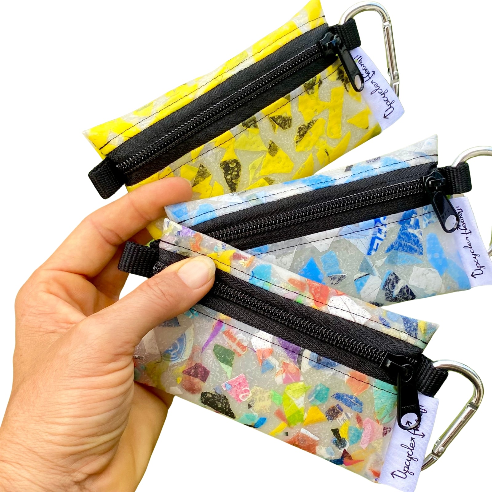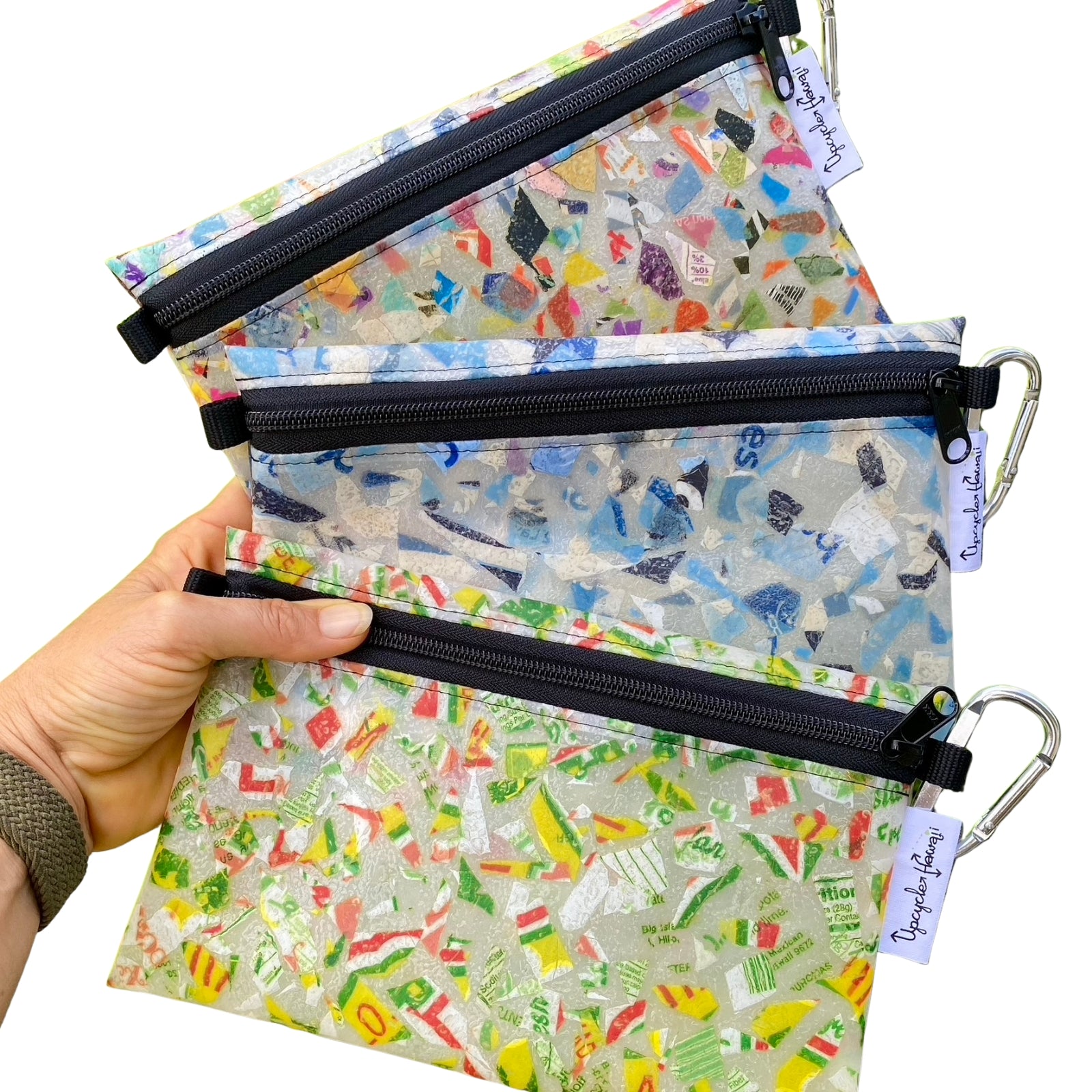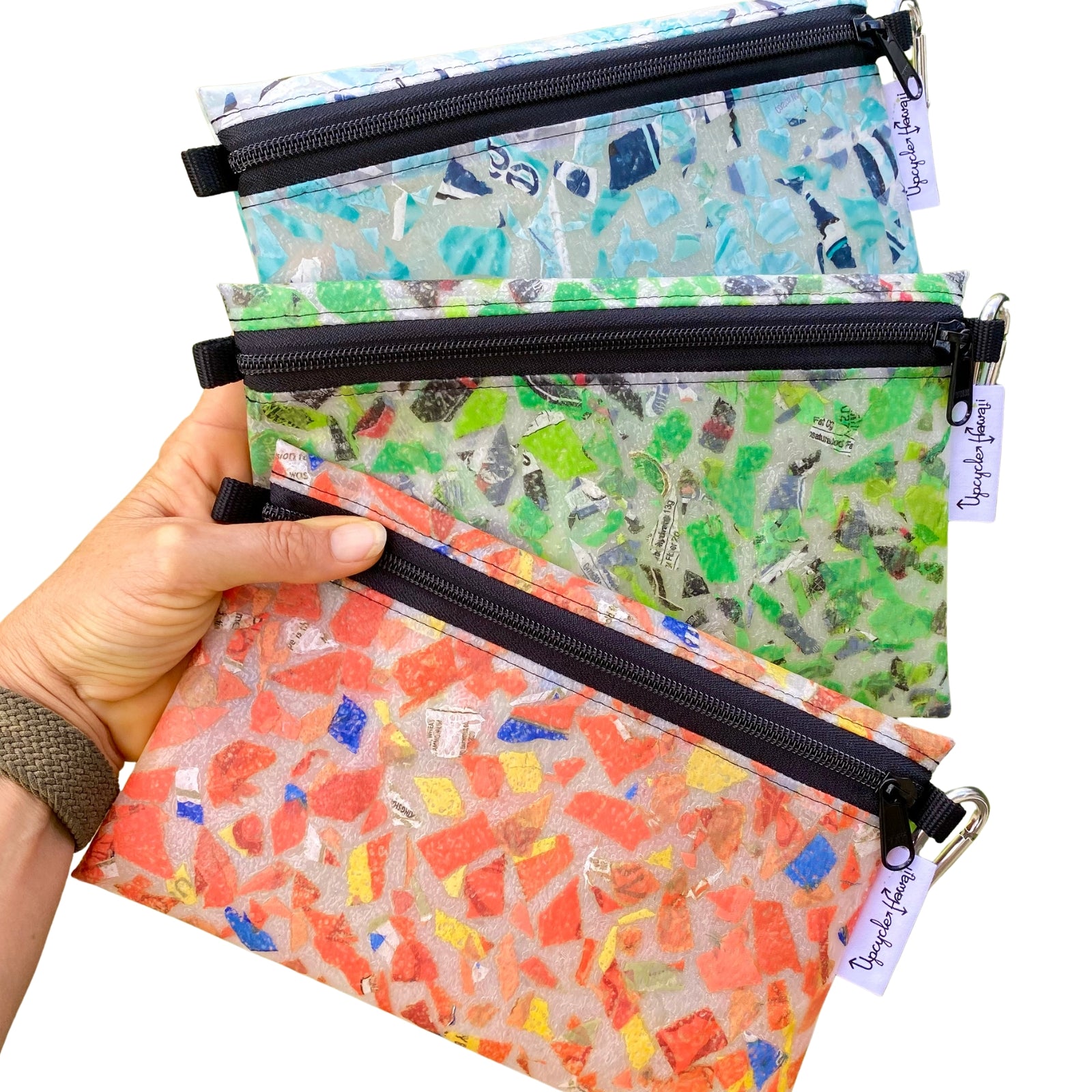 These zipper pouches are handmade using reclaimed sheet plastics collected from local residents and businesses. Heat and pressure are applied to melt multiple layers of shredded plastics and packaging waste together in a fusing process.